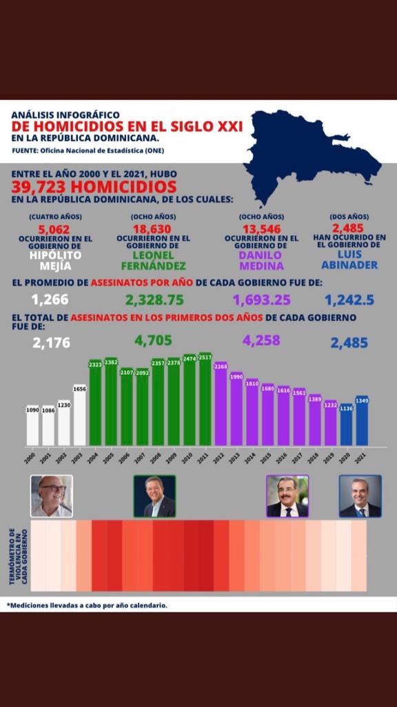 Los registros de la Oficina Nacional de Estadísticas indican, además, que de 2000 a 2004, durante los cuatro años de mandato de Hipólito Mejía se produjeron un total de 5,062 homicidios y en los primeros dos años del presidente Luis Abinader un total de 2,485 delitos de estas características.