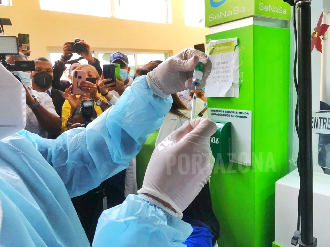 El ministro de Salud Pública aplicó en el Hospital Pedro E. Marchena, de Bonao, la vacuna a la enfermera Marifel Vásquez, la que de manera voluntaria firmó el consentimiento y recibió su tarjeta que la certifica con la primera dosis.