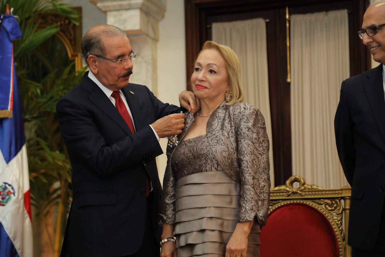 “Gran parte del crecimiento sostenido de nuestra economía se debe al sector de zona franca. Y yo quiero aquí reconocer esta tarde a la directora del Consejo Nacional de Zona Franca, a Luisa Fernández”, dijo Danilo Medina, rodeado de los gestos de grato asombro de los presentes y la condecorada.